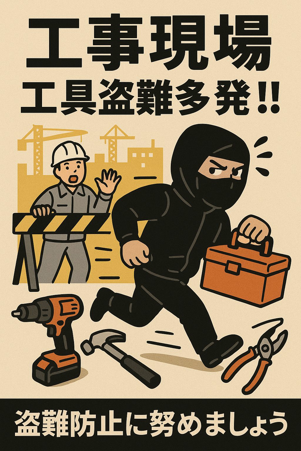 近年、建設現場や工事現場から工具の盗難が多発しております。この傾向は今後ますます増えていくと思われます。大きな理由は人手不足により、海外からの労働者の流入や。海外からの窃盗団が増えているためと思われます。また工事現場での工具の放置やセキュリテイがゆるいために発生するケースや他人の工具を借用して返し忘れ、現場での貸し借り等も考えられます。昔の日本はドアに鍵をかけなくて外出しても物は取られるようなことはなかったり、工事現場でもロープで囲むだけで現場に工具を置いておいても盗まれることはありませんでした。しかし近年はセキュリテイで現場監視していても、強引に取って逃げていくのが珍しくなくなりました。またカメラで監視しても検挙率は低く、工具は戻らず、現場工期が遅れ大きな損害に発展します。